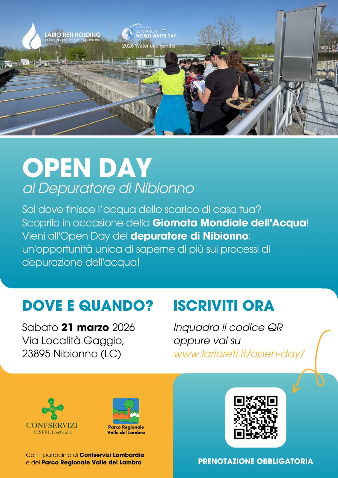 Sabato 21 marzo 2026 si terrà l’Open Day di Lario Reti Holding, presso il depuratore di Nibionno, sito in via Località Gaggio.