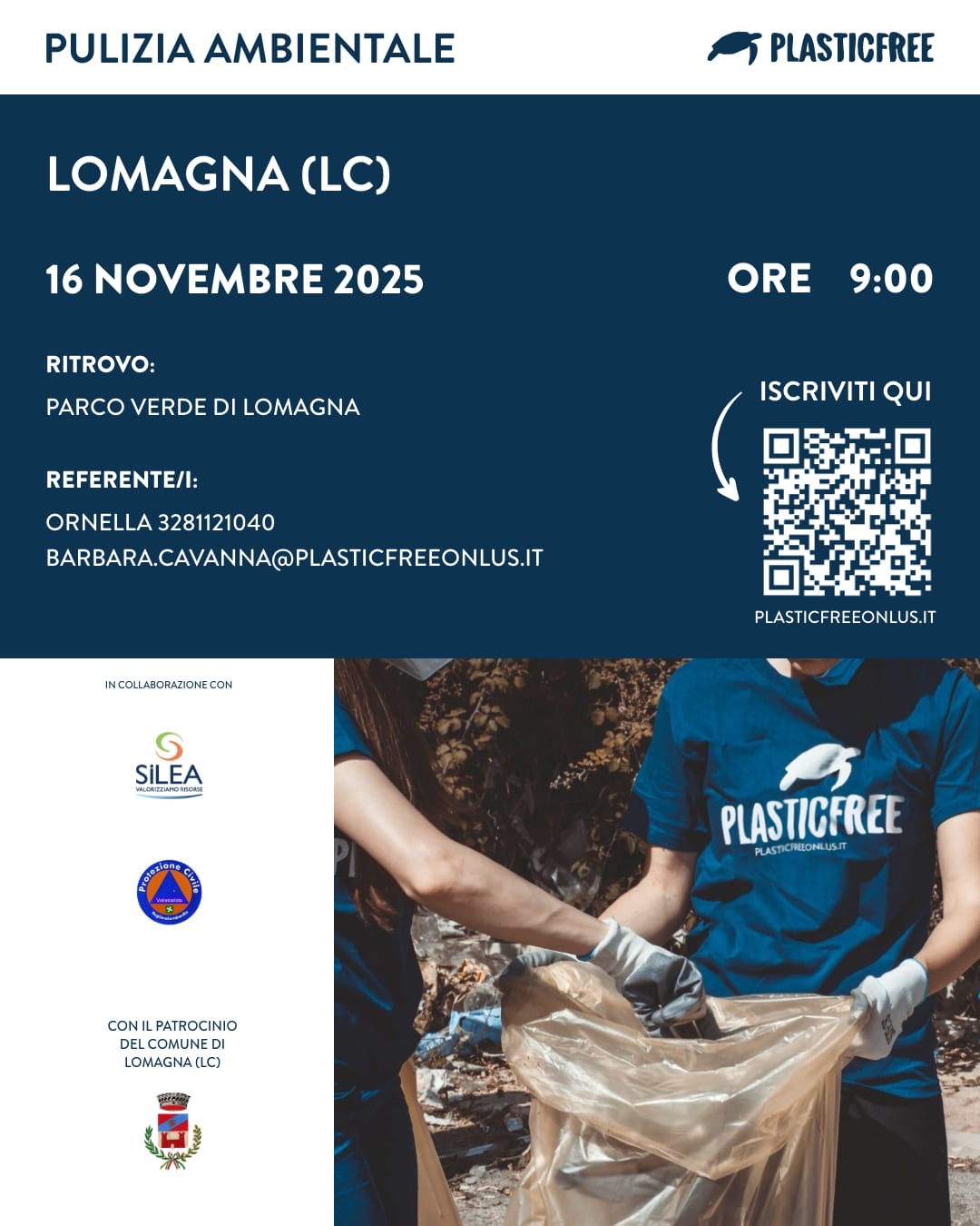 Pulizia ambientale promossa da Plastic Free Italia. Ritrovo presso il Parco Verde di Lomagna, ore 9:00.
